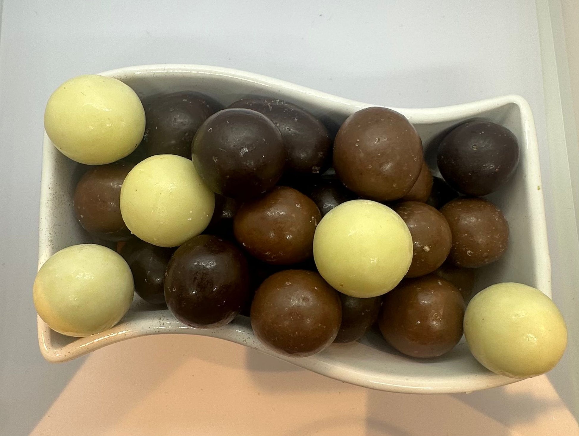 Heerlijke knapperige hazelnoten gedoopt in witte, pure en melk chocola.