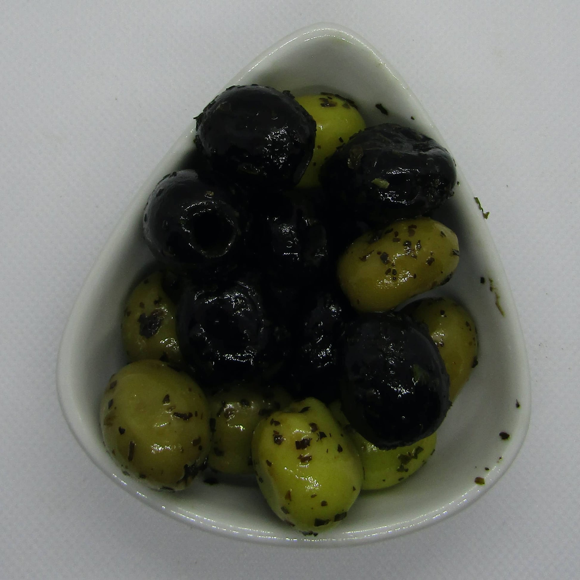 Olijfjes gekruid met basilicum en Italiaanse kruiden.