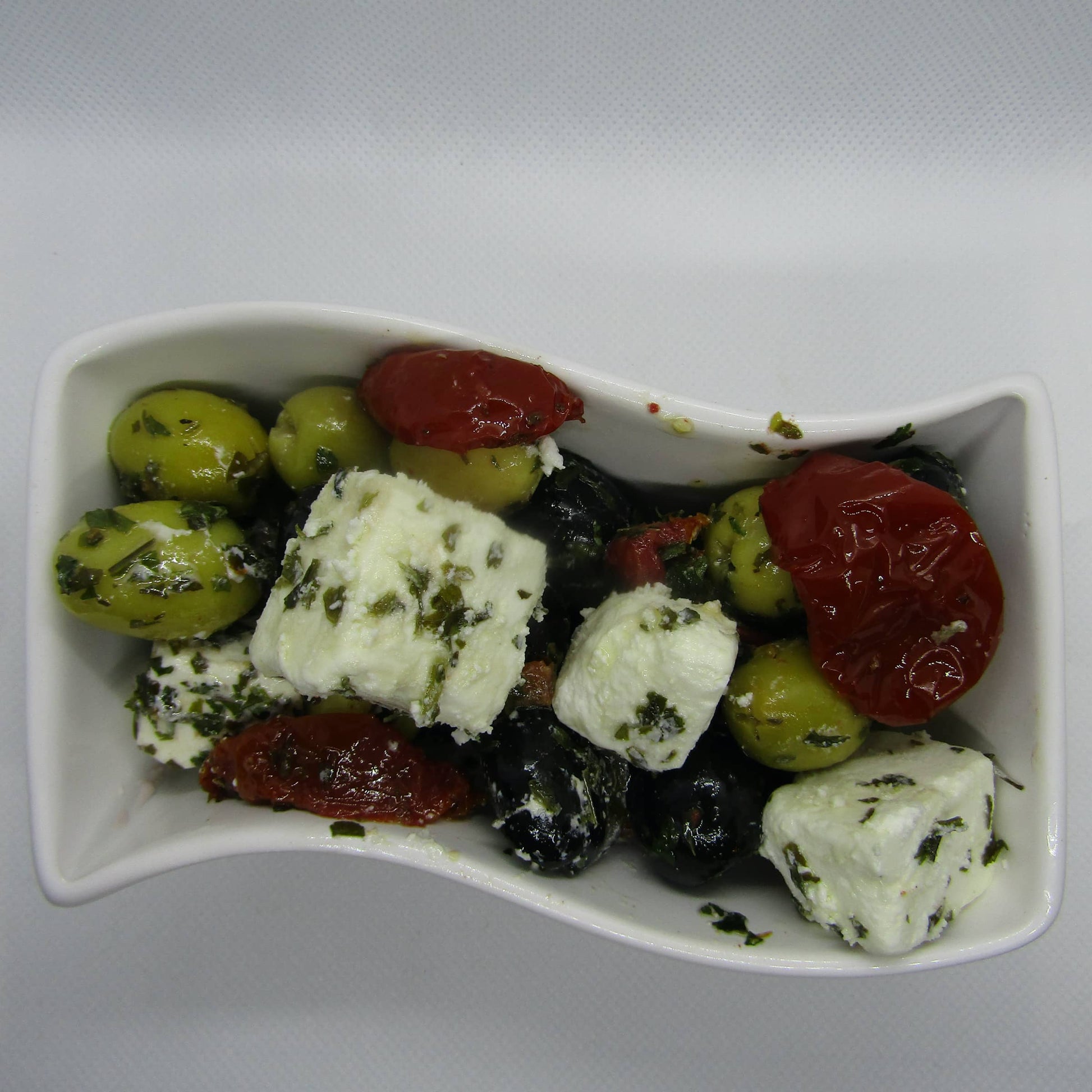 Een heerlijke salade met gekruide fetta blokjes, zon gedroogde tomaatjes en olijven met peterselie gekruid.